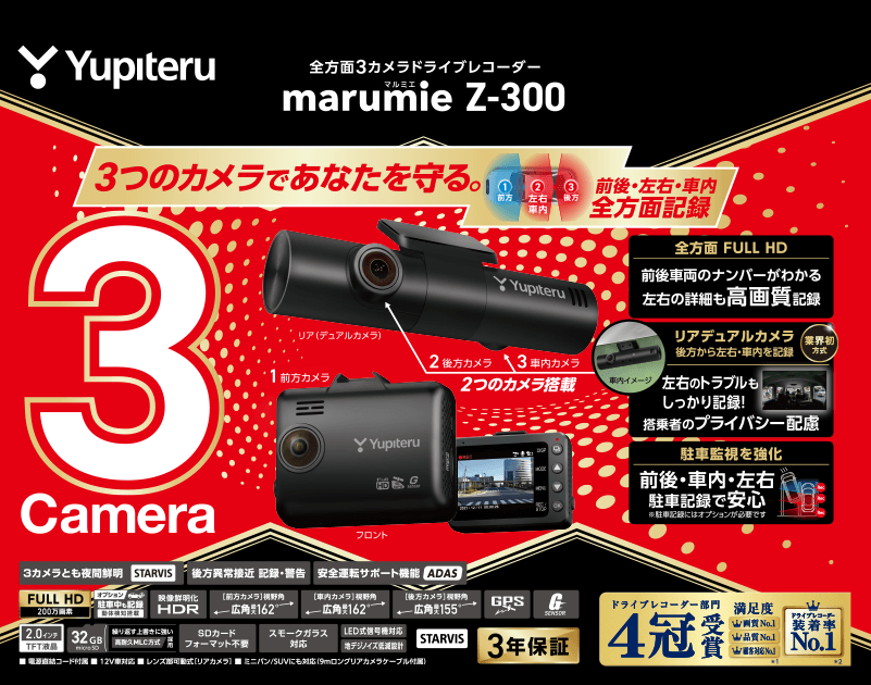 高性能な3つのカメラで、前後・左右・車内のあらゆる状況を記録します。